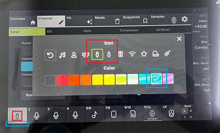 各chのアイコン(赤枠)と、画像だと見づらいですがカラー(青枠)も変えることができます。見た目でどういう機器を接続しているかがわかるのは親切でいいですね。