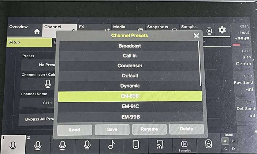 かなりの数のプリセットが用意されていますが、今回はMACKIEのダイナミックマイク「EM-89D」を選んで「Load」してみました。