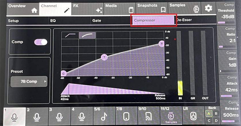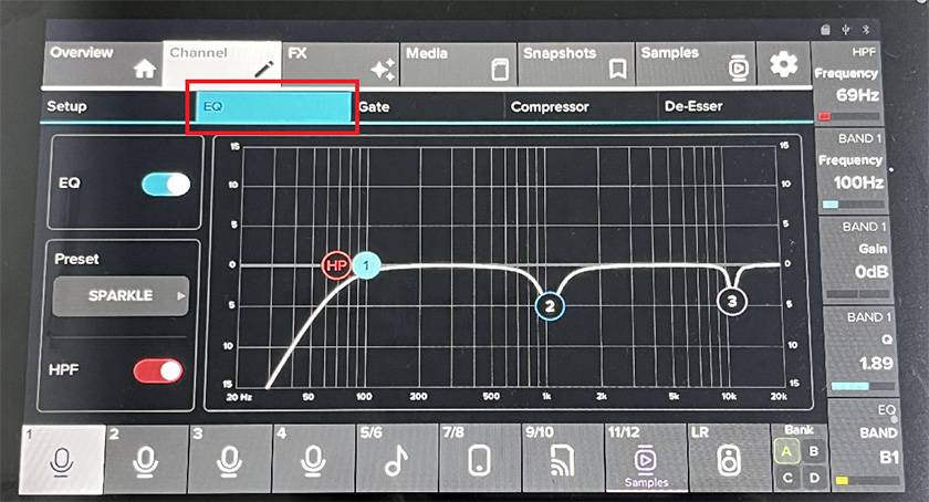 HPFと3つのパラメトリック・イコライザー(PEQ)の設定ができます。PEQはFrequency(中心周波数)、ゲイン、Q(バンド幅)を細かくいじれるので、アナログミキサーでは追い込めない痒い所に手が届く設定も可能です。