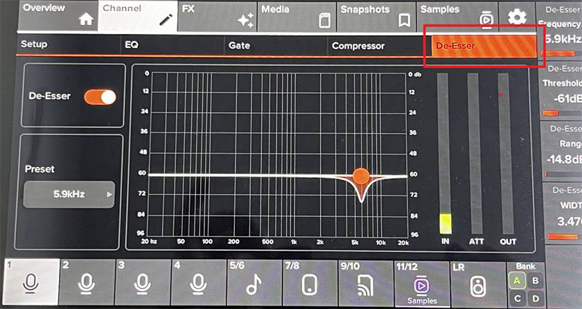 主にマイクの「サ行」などの歯擦音(しさつおん)が耳に刺さるのを抑えるために使われるエフェクトです。歌ったり、アナウンスしたりする際に気になるところを抑えることができます。