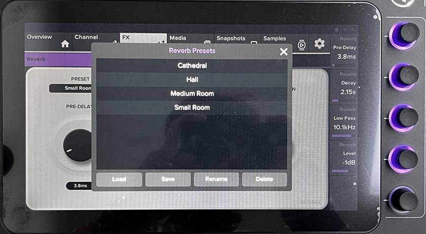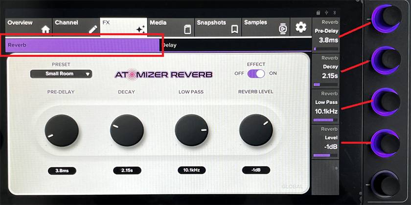 REVERBは、4つのパラメーターでコントロールするタイプで、縦に並んだノブを各パラメーターの調整に使用します。ちなみにタッチパネル対応なので、つまみのイラストを指でタッチしたまま上下に動かすやり方でも調整できます。困った時はプリセットを使いましょう!
