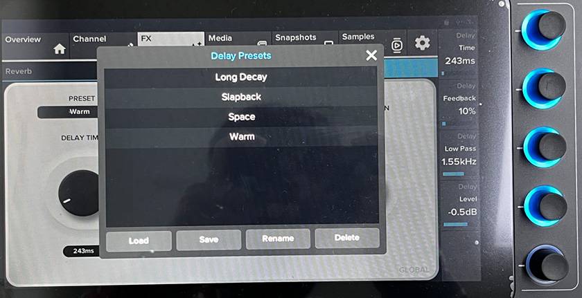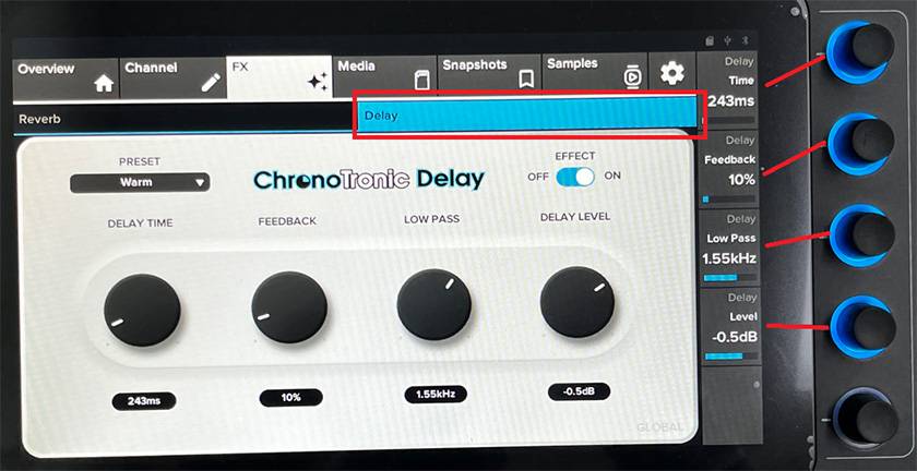 ディレイも同じく4つのパラメーターと4つのプリセットで設定できます。