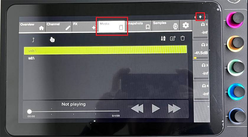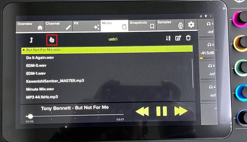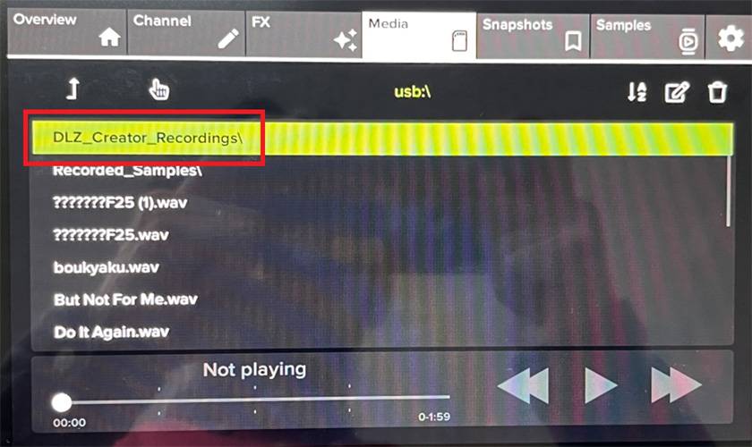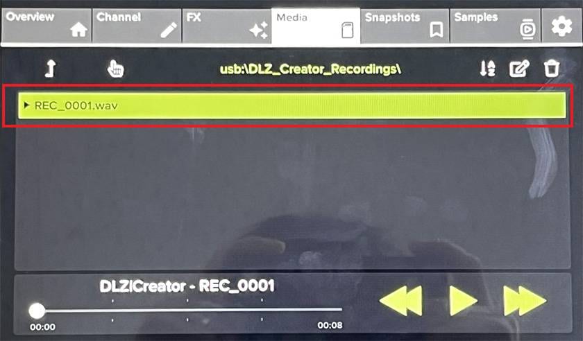 録音された音源を再生するには、「Media」をタッチして、「USB」をタッチしていただくと、「DLZ-Creator_Recordings」が生成されていることを確認できます。