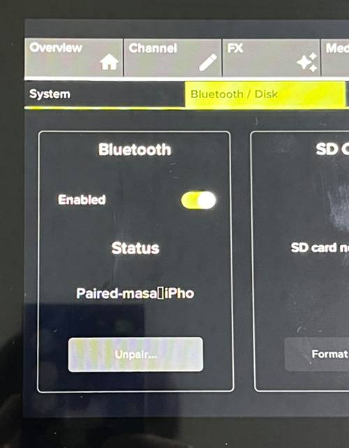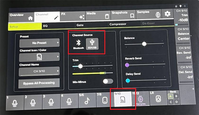 ch9/10の「Channel→setup」にある赤枠部分のSourceが「Bluetooth」になっていたことが原因でした。ここを「SD/USB」にして解決。音がちゃんとスピーカーから鳴り始めてくれました。