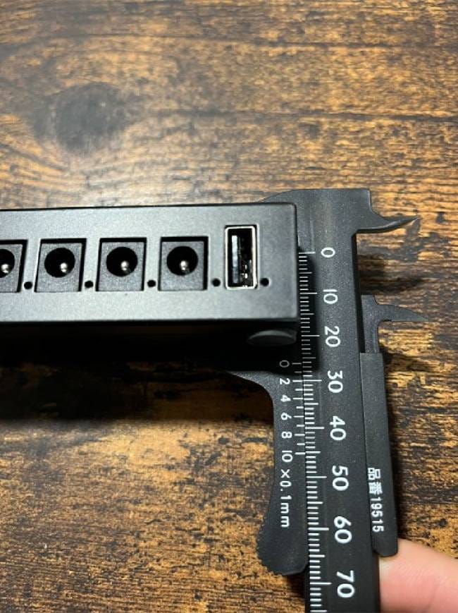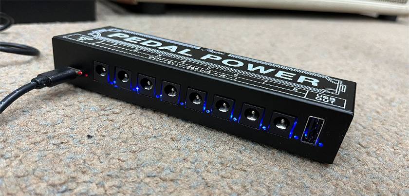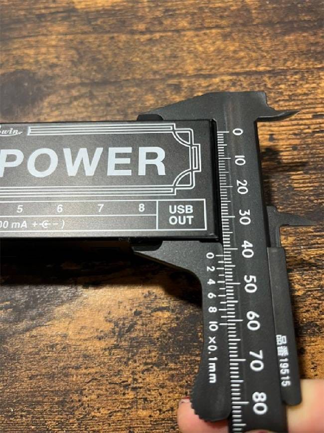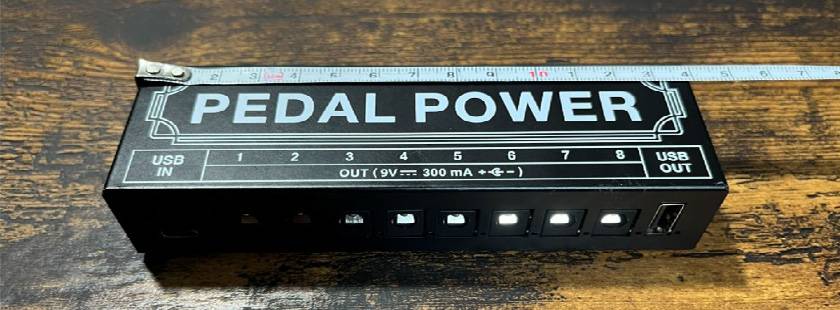 肝心の電源出力ですが、8つのポート全てがDC9V、センターマイナス、300mA です。500mA 以上や12V、18Vの出力こそ持ちませんが、平均的なエフェクターなら駆動させる ことができるでしょう。ROWIN、PLAYTECHのエフェクターは基本的に使えると思います(12V駆動のPLAYTECH/Antlia Talkboxを除く)。ちなみにUSBポートは5V1A出力です。