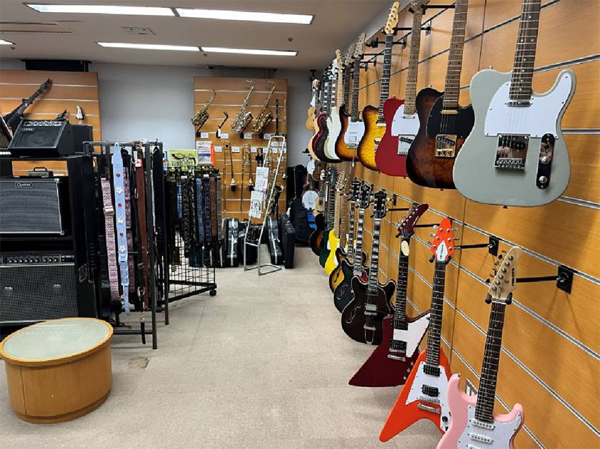↑エフェクターもたくさん展示されているショールームのギター部屋へ。