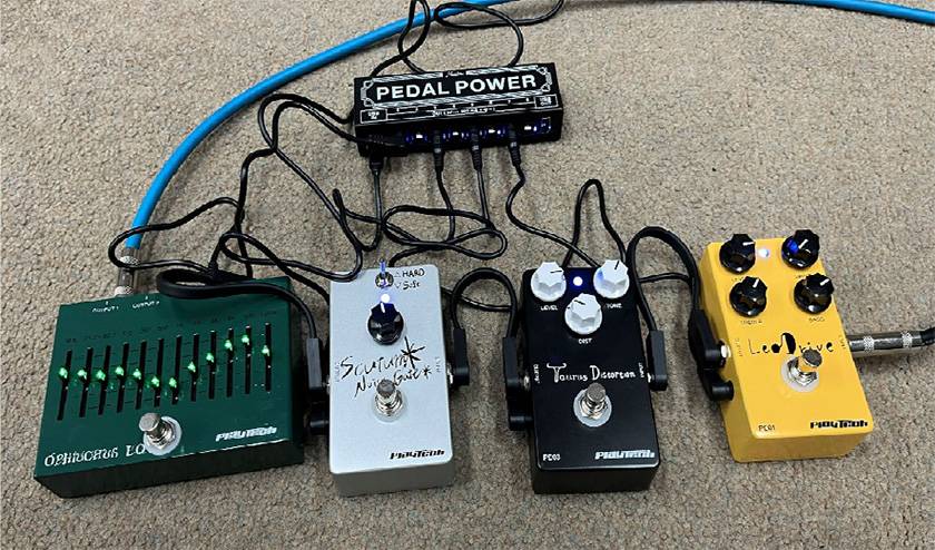 Taurus Distortionをメインの歪みに、Leo Overdriveはゲイン低めレベル高めのブースト設定にしてハリを出し、Scutum Noise GateとOphiuchus EQで整えてみました。ノイズゲートを入れはしましたがサプライによる電源供給に伴うノイズは皆無で、とても快適です。また地味に嬉しいポイントがありまして、PLAYTECHのエフェクターは筐体の側面に電源ケーブルを接続するタイプが多いのですが、本機に付属するDCケーブルがジャストフィット。省スペースでボード構築できると思います。ちなみに使ったギターはMichael Kelly GuitarsのLPタイプ、Patriot Decreeです。