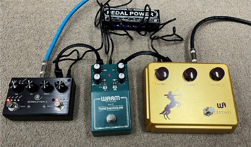 前段のWARM AUDIO/Centavo、Tube Squealerの2つの歪みエフェクターでクランチ~オーバードライブをカバーし、PIGTRONIX/Echolution3の複雑なディレイ&モジュレーションで遊べるセッティングにしました。サプライが小さいのもあるのですが、Centavo がすごく大きく見えます。所有欲が満たされてとても良いエフェクターです。Echolution3は操作方法に少々クセがあるため狙ったサウンドを出すのは試行錯誤が必要ですが、ふとしたタイミングで出力されるツボな音を探すのが楽しいエフェクター。ちなみにアナログとデジタルのエフェクターを並べていますが、ノイズ無く◎。