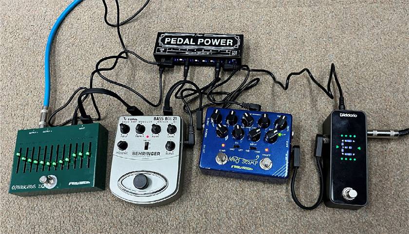 ちょうど気になっていたので、話題のPLAYTECHプリアンプNAVY STOMPと定番人気プリアンプBehringer/BDI21を直列で繋げてみました。またこのタイミングでD'Addarioのペダルチューナーを見つけて繋いでみたところ、画面が大きくて視認性が良く、チューニングしやすいです。Ophiuchus EQは先ほど使っていたのと同じものですが、ベースに繋いでも十分に働いてくれます。BDI21をバキバキにひずませつつ、NAVY STOMPのコンプとOphiuchus EQで使える音に落ち着かせるセッティングです。ベースはMichael Kelly GuitarsのJBタイプ、Element 4を使いました。