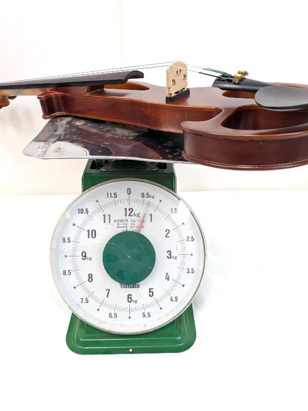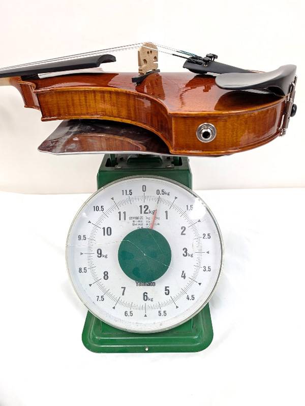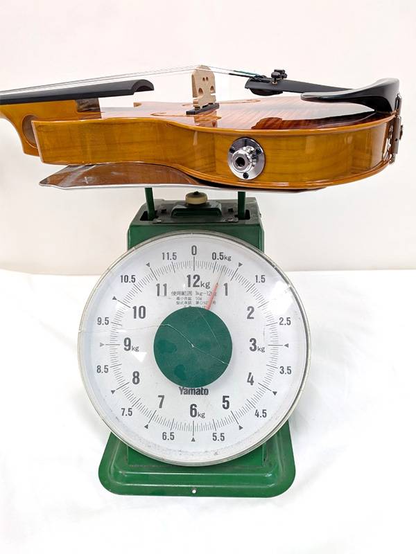 約500g でした!参考までにPLAYTECHのPSV100BRエレクトリックバイオリンも測ってみたところ、重量は約700gでしたので、200gも差があります。