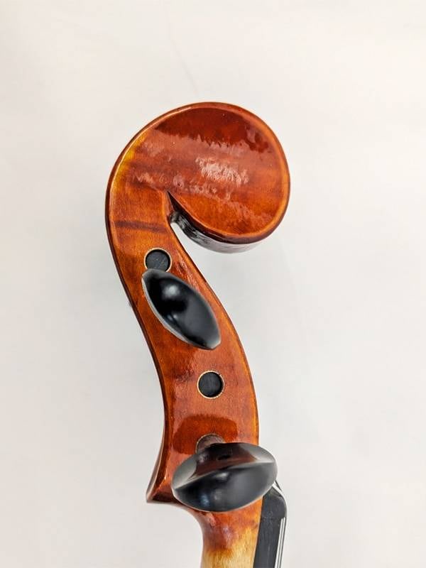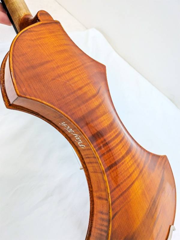 これは写真ではなかなか伝わらず、実際に見て一番感じることですが、木目がかなりはっきりと出ていました。特に裏板は綺麗な虎杢になっており、ヘッド部分や側板も見ていて楽しいぐらいに美しい仕上がりになっています。渦巻部分もPEV144オリジナルのデザインとなっており、PLAYTECHのロゴも銀色で加工されていますので、目で見て楽しめるエレキバイオリンとなっています!