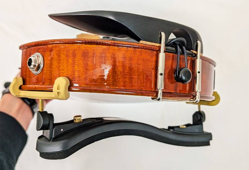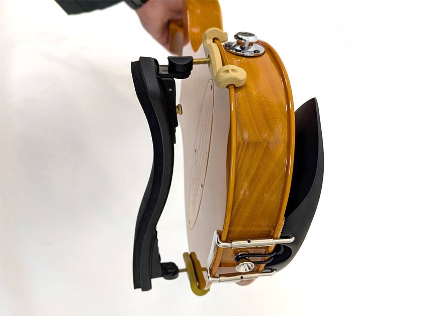 通常のKUNなど一般的な肩当てであれば問題なく使用できますが、VIVA LA MUSICAのように脚部が大きいタイプの場合は、装着がやや難しい可能性があります。そのような場合はパッドタイプの肩当てを使ってもいいかもしれません。