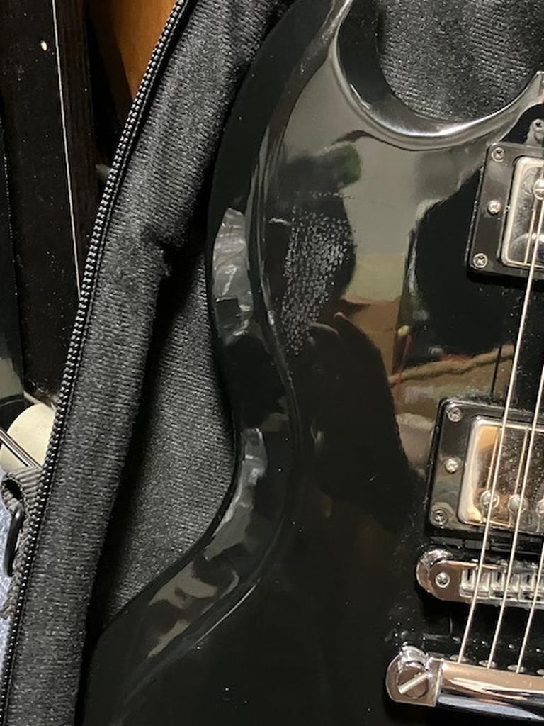 このギグバッグは数年前から数本購入しており、GIBSON LP MELODY MAKER、SG-STDにも使用してきました。 先日、久しぶりにSG-STDを弾こうと思ってバッグから取り出したら、トップの塗装が2か所溶解していました。 内張りに縫い付けてある合成皮革生地がトップのラッカー皮膜を浸食してしまい、トップがまだら模様になってしまいました。 残念ですが、このギグバッグには高価なギター、ラッカー仕上げのギターには不向きのようです。 大切なギターを傷つけられても自己責任になりますので、高いギターにはお勧めしません・・。 ![]() ![]() | ||