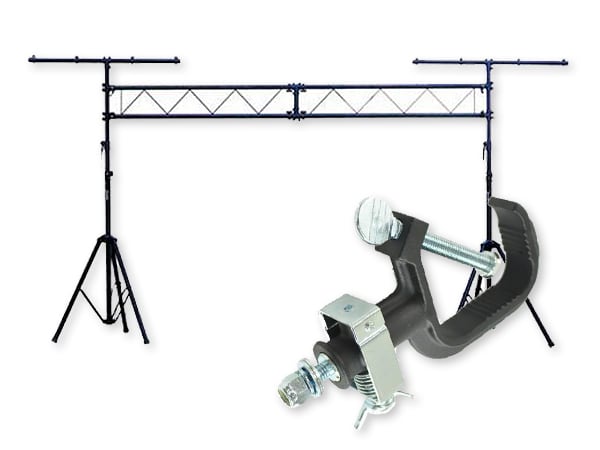 照明機器をバトンに吊り下げたり、床に設置する際に用いられる器具や、各種照明スタンドなどについて紹介します。