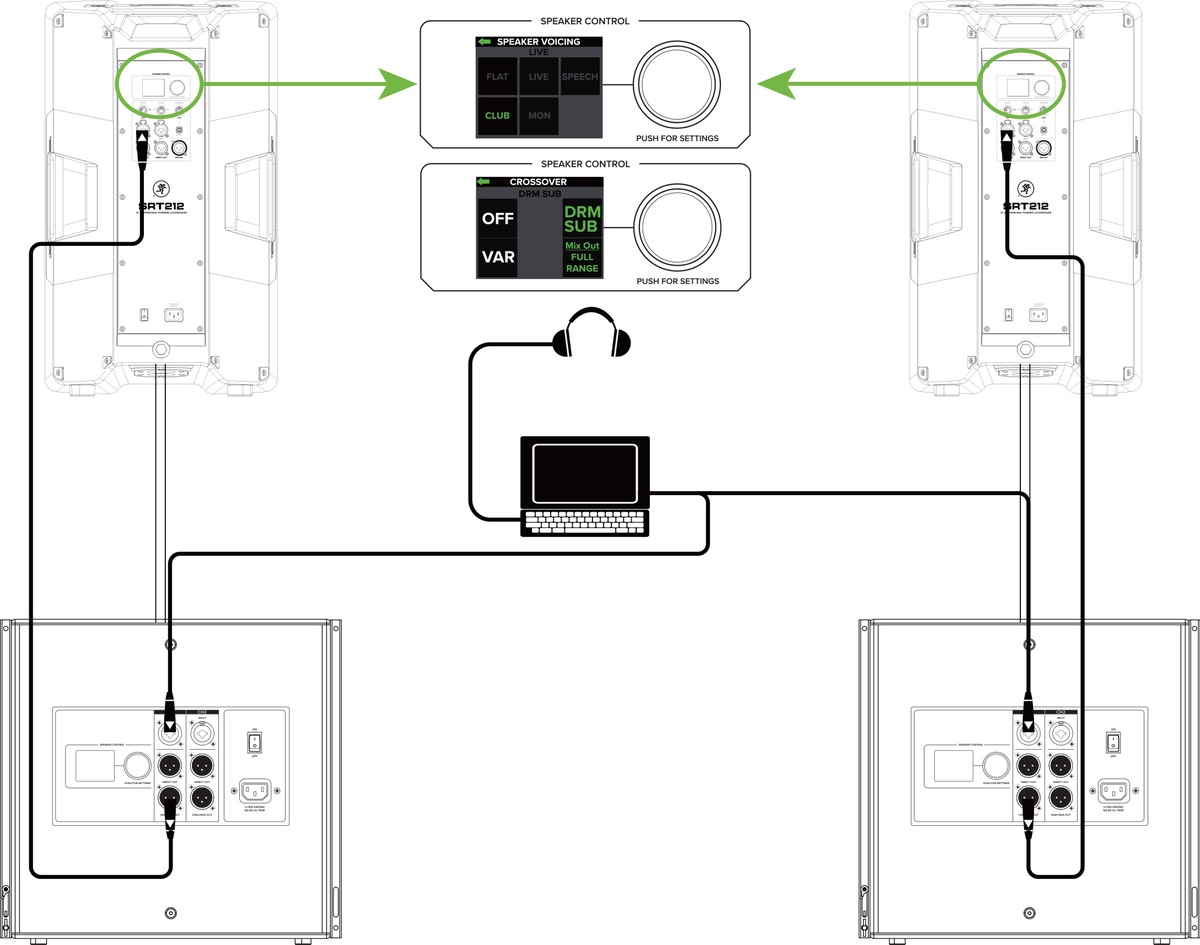 この例では、ラップトップが2台のサブウーファー DRM18S のそれぞれのCh.1入力端子に接続されています。またラップトップのフォン入力端子にはヘッドフォンMC-450が接続されています。