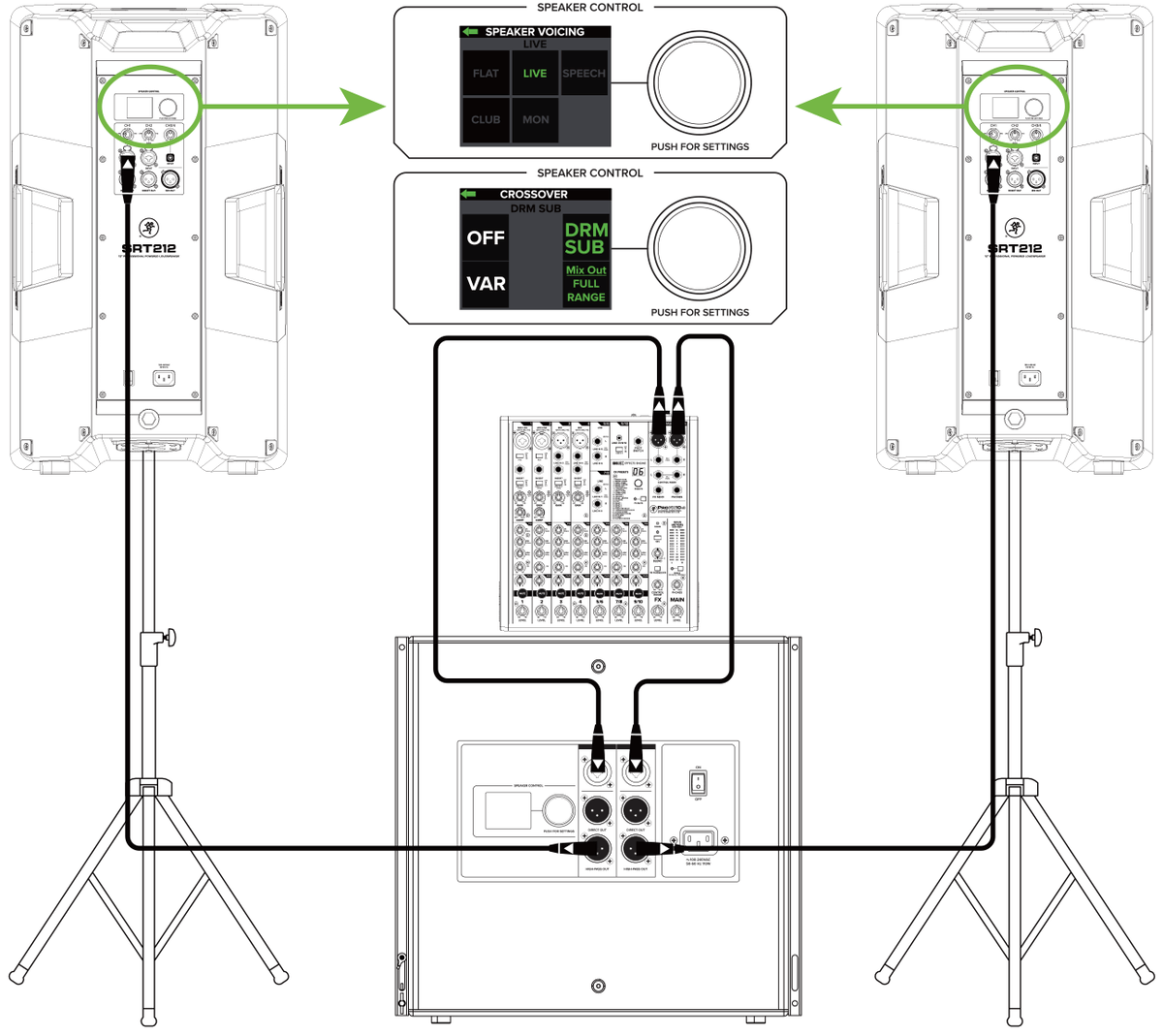 この接続例では、SRM1850 と SRM450v3 を使用してサウンドシステムを構築しています。 小規模クラブに厚みのあるサウンド を提供する理想的なセットアップです。