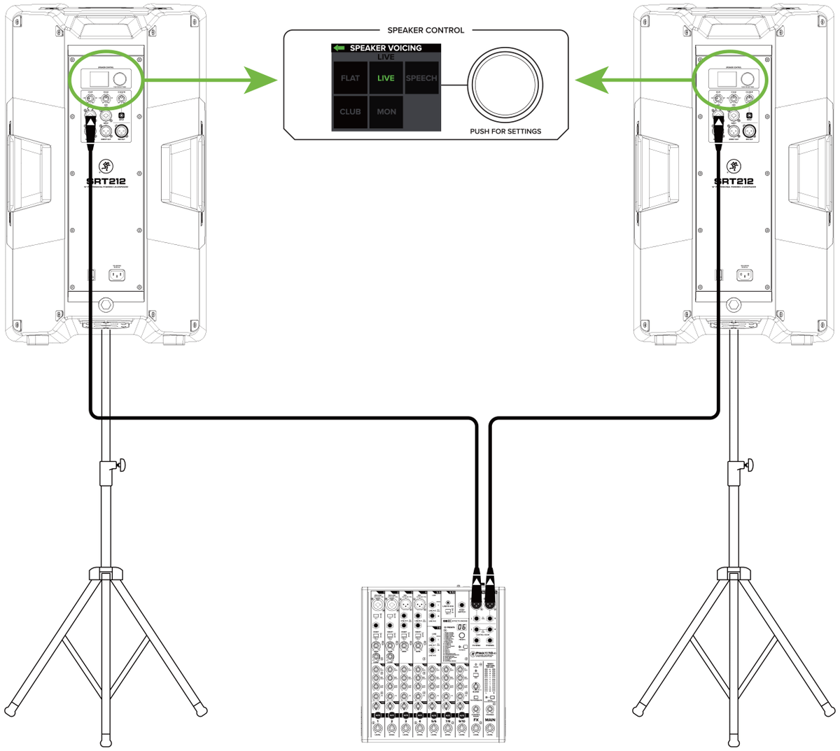 出音に対して任意のスピーカーモードを選択できます(詳細は9ページ参照)。 このようなライブサウンド向けセットアップでは PAモードがお勧めです。 SRMv3 をモニタースピーカーとして使用する場合は Monitor を選択します。