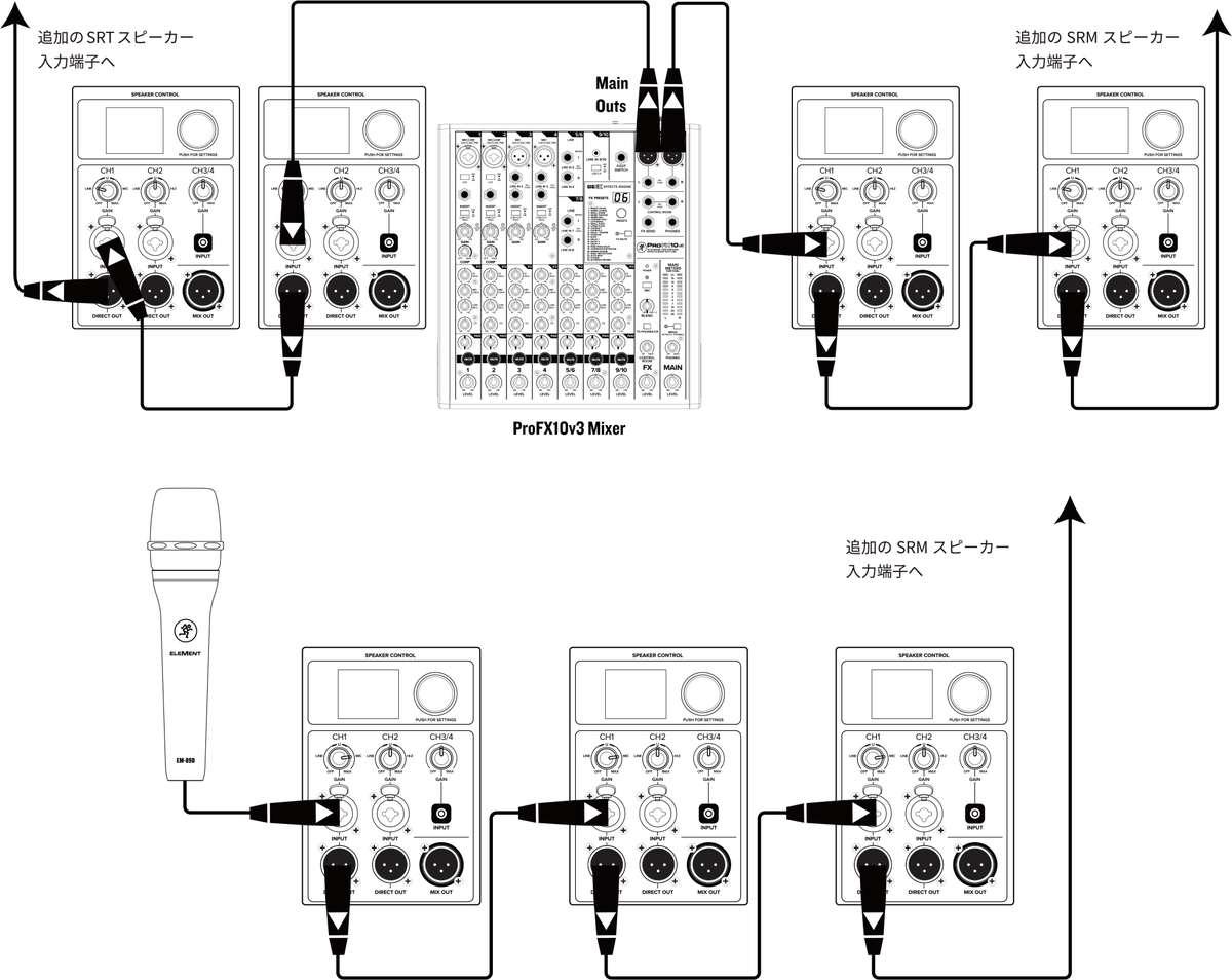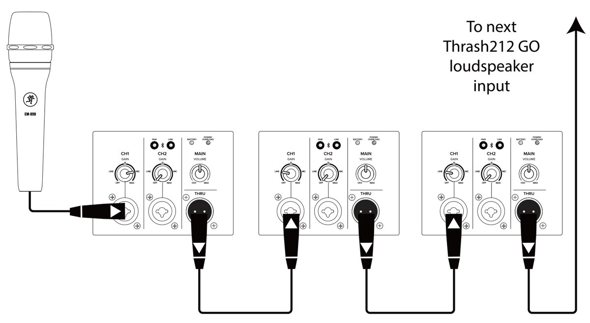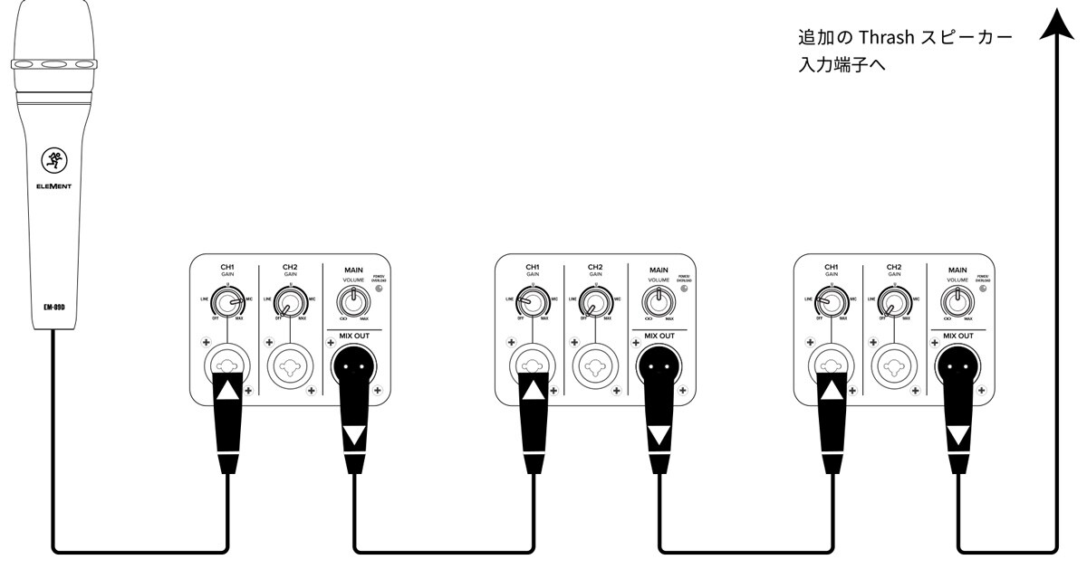 Thrash シリーズは「MIX OUT」と印字されたXLR オス端子を使って、デイジーチェーン接続することができます。音源(ミキサーの出力もしくはマイク)を入力端子に接続し、Thrash の M IXOUT 端子を次の Thrash の入力端子に接続します。これを繰り返し、複数台のスピーカーをデイジーチェーン接続します。上の接続図をご参照ください。
