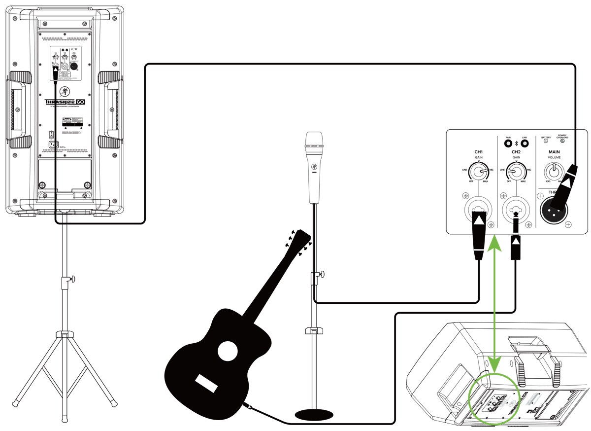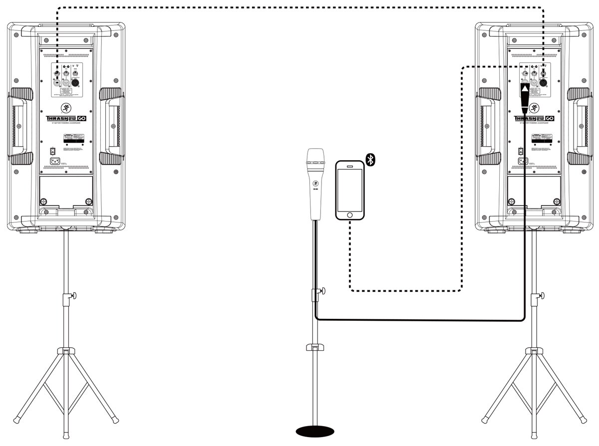この例では、ダイナミックマイク(MackieEM-89D)をThrash212 GOのCh.1に接続します。この時Ch.1のGAINノブは「MIC」の位置へ設定してください。さらに、スマホを Bluetooth接続して音楽を流しましょう。スマホの音量は大きめに!