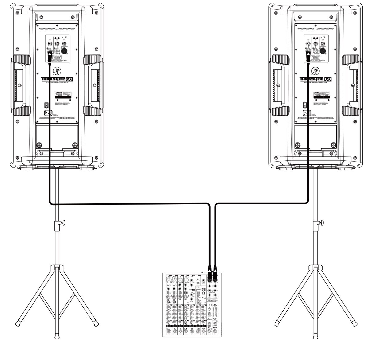 この例では、ミキサー(ProFX10V3)を直接2台のThrash212 GOと接続しています。このセットアップは小さなキャパシティのクラブにぴったりです。ミキサーの出力端子を各 Thrash212 GOのCh.1 入力端子に接続すればOKです。GAINのノブはどちらも「LINE」で揃えます。