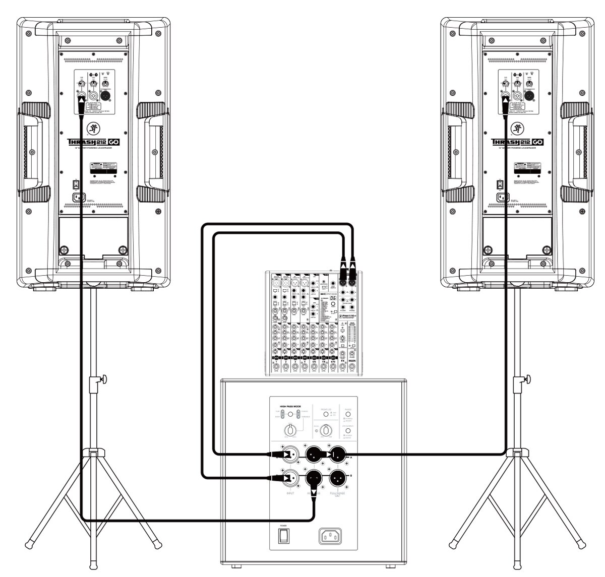 Thrash212 GOは、XLR オスケーブルを「THRU」に接続してデイジーチェーンすることも可能です。ミキサーやマイクなど何らかの音源の出力を、Thrash212 GOの入力端子と接続します。そしてそのThrash212 GOのTHRU端子をもう1台の Thrash212 GOの入力端子にパッチします。この手順を繰り返せば、複数台の Thrash212 GOをデイジーチェーンできます。上の図を参考にしてください。