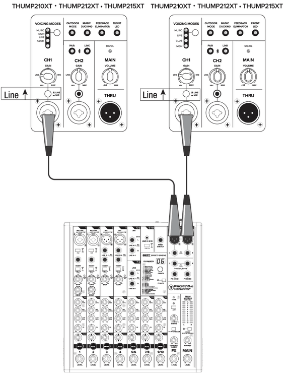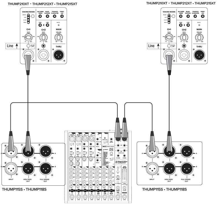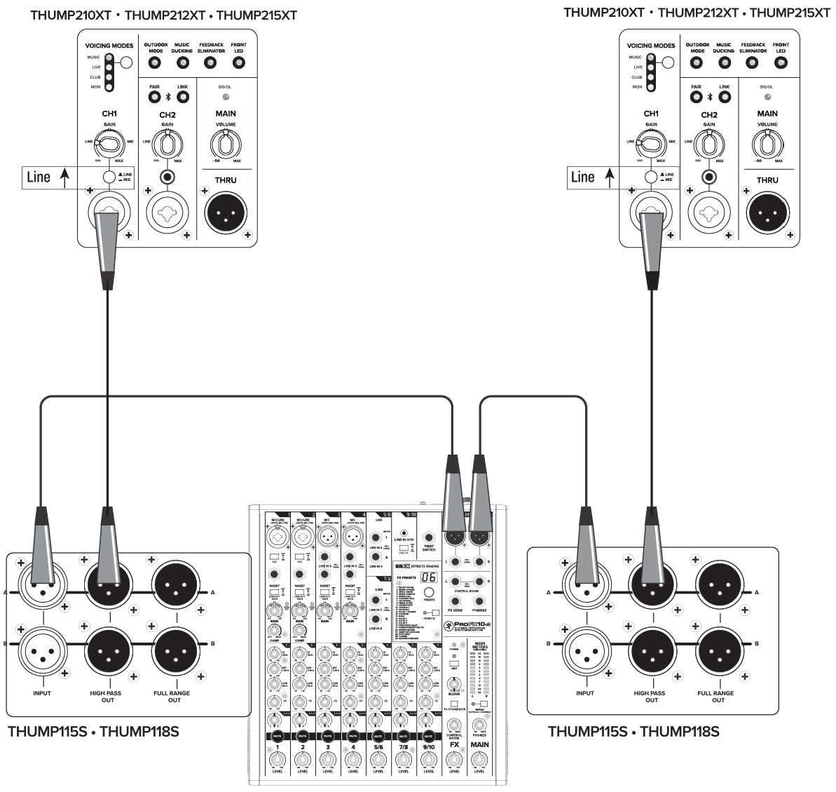 この例では、ProFX10V3が2台のThrashと接続されています。小さなクラブには最適のセットアップです。ここでは、ProFX10V3のL/R 出力が直接両サイドの Thrash の Ch.1入力端子に接続されています。Ch.1のGAINを「LINE」の位置に設定してください。GAINノブの「MIC」と「LINE」マークはあくまで参考値であり、必要に応じて適宜調整してください。