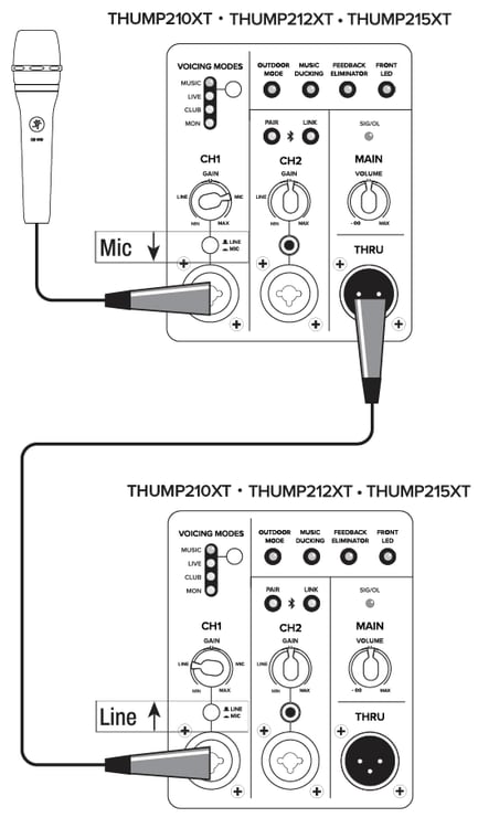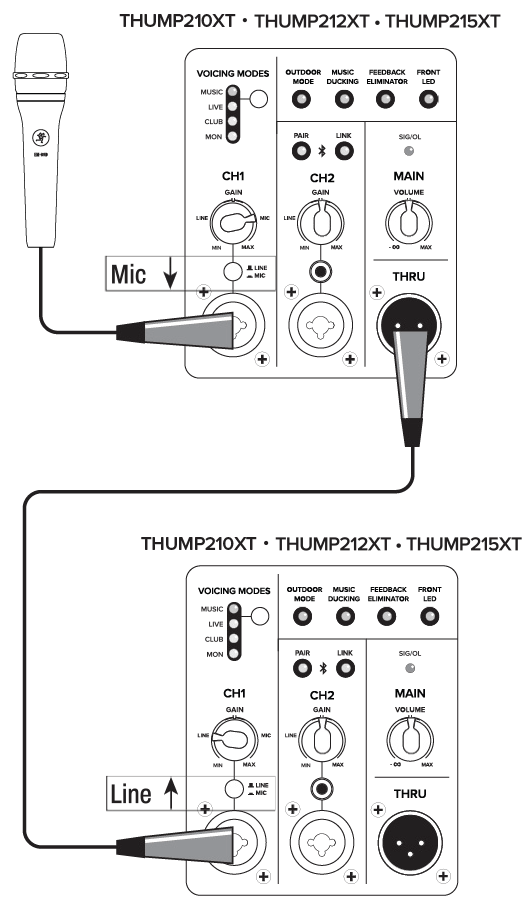 注意:GAINノブが正しく設定されていることを確認してください。ミキサーなどラインレベルの音源を利用してデイジーチェーン接続を行う場合(上側の接続図を参照)は、すべての入力チャンネルのGAINノブは「LINE」の位置に設定してください。マイクレベルの音源を使用してデイジーチェーン接続を行う場合(下側の接続図を参照)は、マイクを接続した1本目のThrashのGAINノブは「MIC」の位置に、2本目以降の ThrashのGAINノブは「LINE」の位置に設定してください。GAINノブの「MIC」と「LINE」マークはあくまで参考値であり、必要に応じて適宜調整してください。
