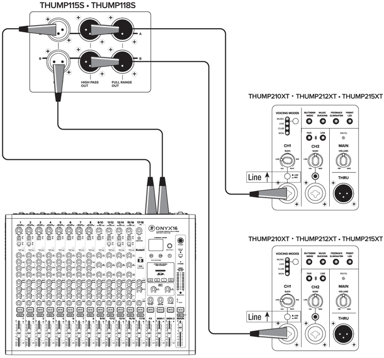 さらに低音をブーストしたければ、ミキサーにサブウーファーを追加します。ミキサーのL / R 出力端子を直接サブウーファー(Thump118S)のチャンネルA/Bに接続しています。サブウーファーの HIGH-PASS 出力は2台の Thrash212 GOのCh.1入力にそれぞれ接続します。2台のThrash212 GOのGAINノブは、どちらも「LINE」の位置に設定してください。