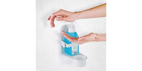 消毒液ボトルを手の届きやすい位置に設置し、人の出入りが多い場所でも、スムーズに手指消毒を行うために使用します。