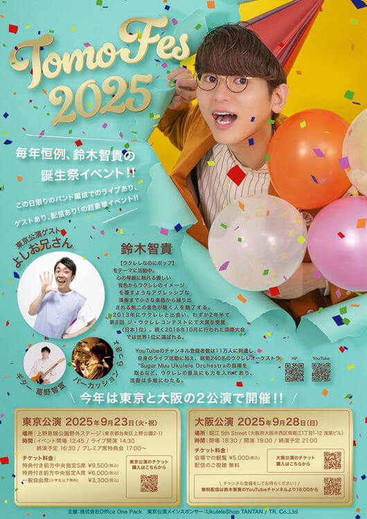 鈴木智貴さんの誕生祭イベントとして毎年開催されてきた「TomoFes」。今年はさらに規模を拡大し、東京と大阪の2公演が実現しました。東京公演は初の野外ステージによるフェス・スタイルで開催!バンド演奏や豪華ゲストの出演に加え、大抽選会も行われ、ウクレレの魅力にあふれた忘れられない一日となりました。そんな「TomoFes2025東京公演」に、今回はサウンドハウスもブースを出展。当日の模様をレポートします♪