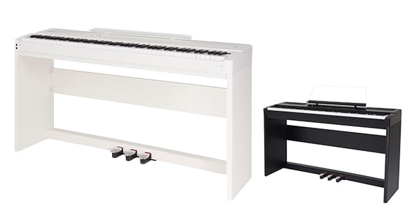 さまざまな機能を楽しめる88鍵電子ピアノ。リッチな弾き心地の象牙調鍵盤を採用しています。幅広い音楽表現が可能な90音色を内蔵。ボタンを押すだけで簡単にキーチェンジができるトランスポーズ機能を装備し、弾き語りにも最適です!黒と白の2色展開。スタンドや椅子のセット品もあります。