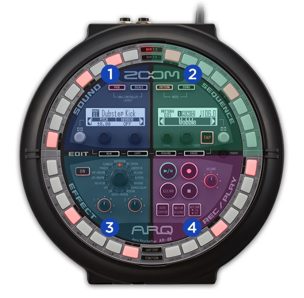 『AR-48』は、トラックメイクやパフォーマンスのためのエキサイティングな機能が用意されています。サンプルやインストゥルメントのパッド演奏はもちろん、シーケンスを再生しながら即興でリミックスやアレンジを施したり、リングコントローラーでサウンドに変化をつけたり、MIDIアウトを使用して外部インストゥルメントをコントロールすることも可能です。