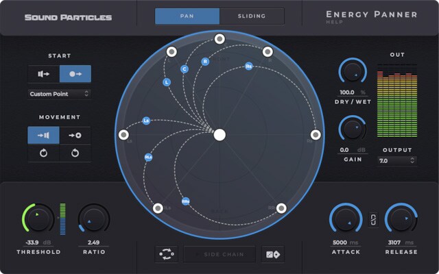 サウンドの強さがパンナーをコントロールします。音源に反応して動作を作り出す仕様です。想像してみて下さい。ビートやアクセントに合わせてドラムやシンセ・サウンドが動き回ります。音楽からポストプロダクション用途まで、そしてステレオからDolby Atmos?互換の出力まで対応します。