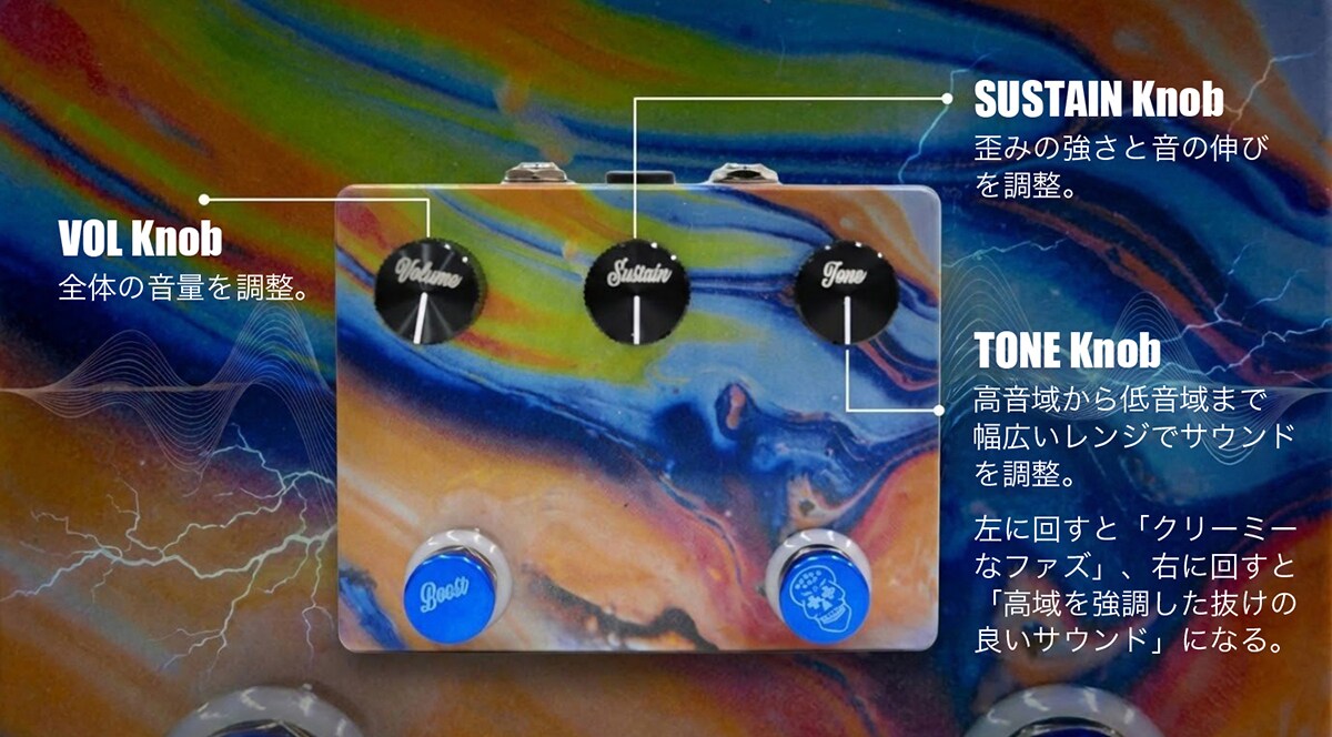 まず見た目が個性的です。グラデーションっぽい感じが可愛らしく、今までになかったような見た目のエフェクターでワクワクします。筐体はすごくしっかりとしていて、ツルツル、ピカピカです。個人的にかなり好きな音でした。Bass Filtronと併用してシンセのような音も出せますが、単体でもシンセっぽい音を出すことができ、バリバリとしたファズの音で、音の伸びもちょうど良いです。また、かなり歪ませても、どこでピッキングしたのかしっかりとニュアンスを出してくれます。自分の好みの音を見つけて使うのも良いですし、ソロの時にブーストスイッチを押すのも良いと思います。さらに、かなり派手な音も作ることができ、音作りの幅も広く、音も太く、多様な使い方ができるペダルです。