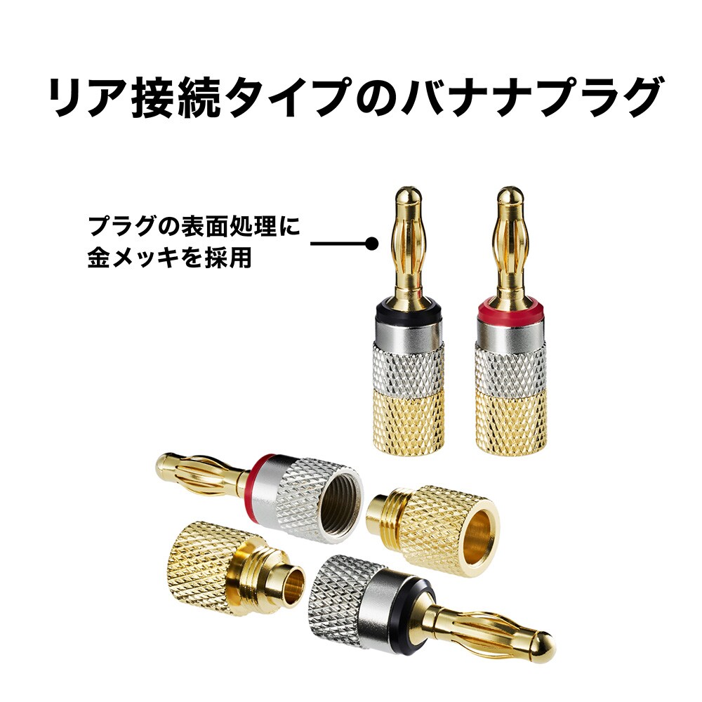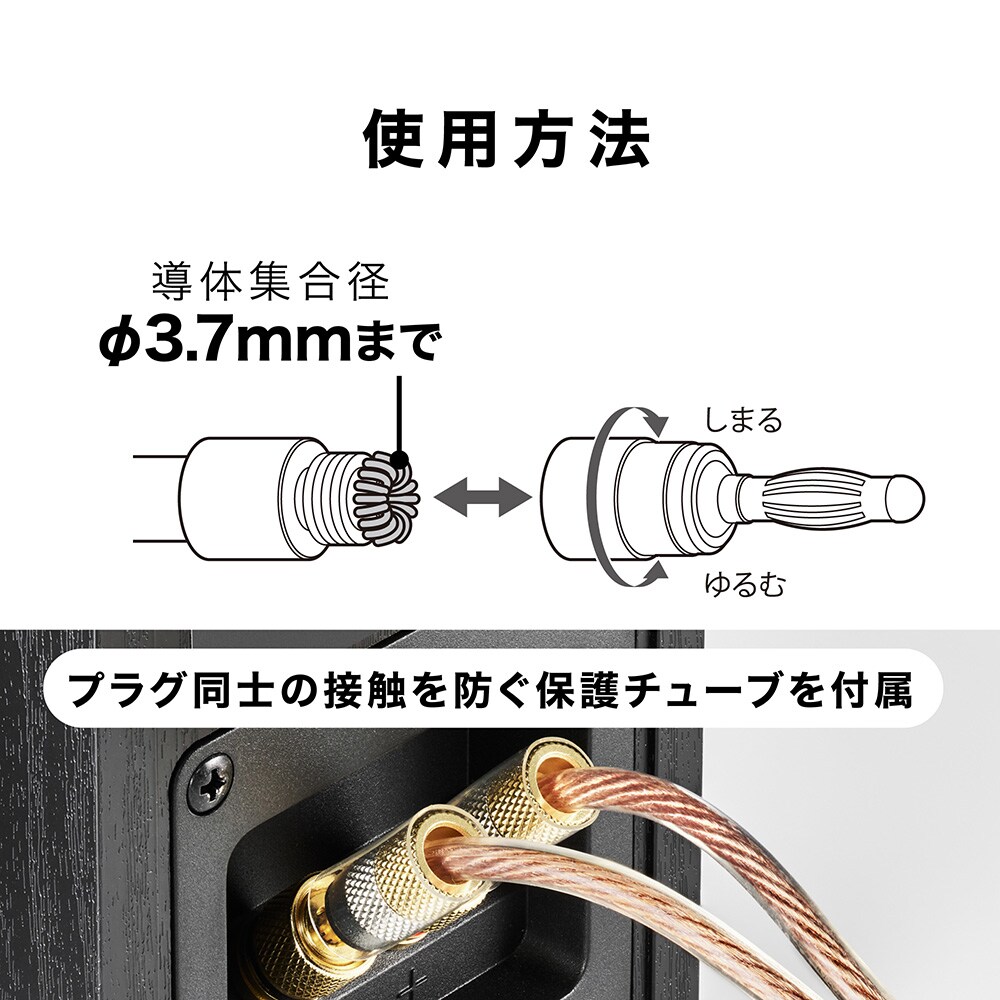 導体集合径3.7mmまでのスピーカーケーブルに対応。 リア接続タイプのバナナプラグ。