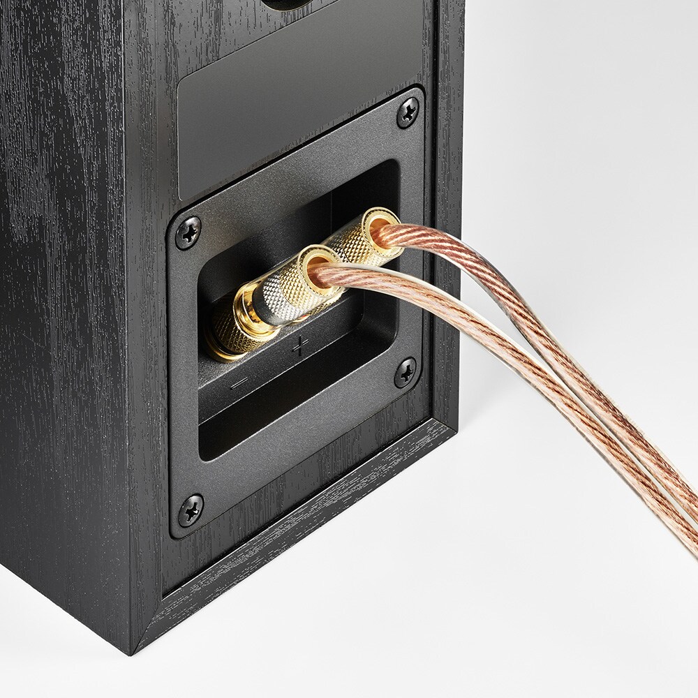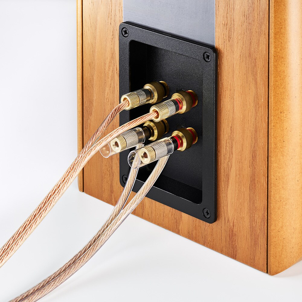 ■リア接続タイプ:導体集合径3.7mmまでのスピーカーケーブルとの組み合わせが可能。堅牢なメタルボディにケーブルを折り込み、ねじを締めることで確実に固定できます。また、赤と黒のリングにより、セッティングしたケーブルをすぐに見分けられます。