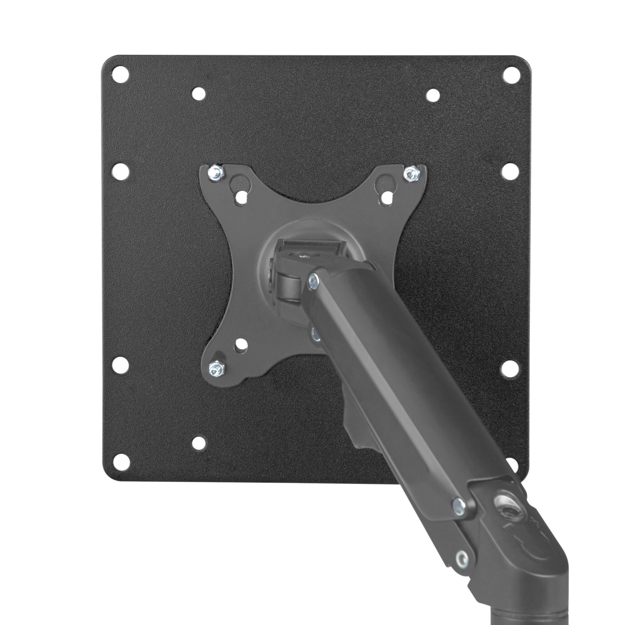 VESAマウント変換用のプレート「GH-VCPA-BK」。モニターアーム側の50/75/100mm規格を、200×100/200×200の横長VESAに変換でき、大型のテレビやディスプレイの設置に対応。耐荷重30kgで安心でき、ネジ3種+スペーサー付属。堅牢な2mm厚プレート&粉体塗装仕上げで、安定性を重視したアクセサリです。