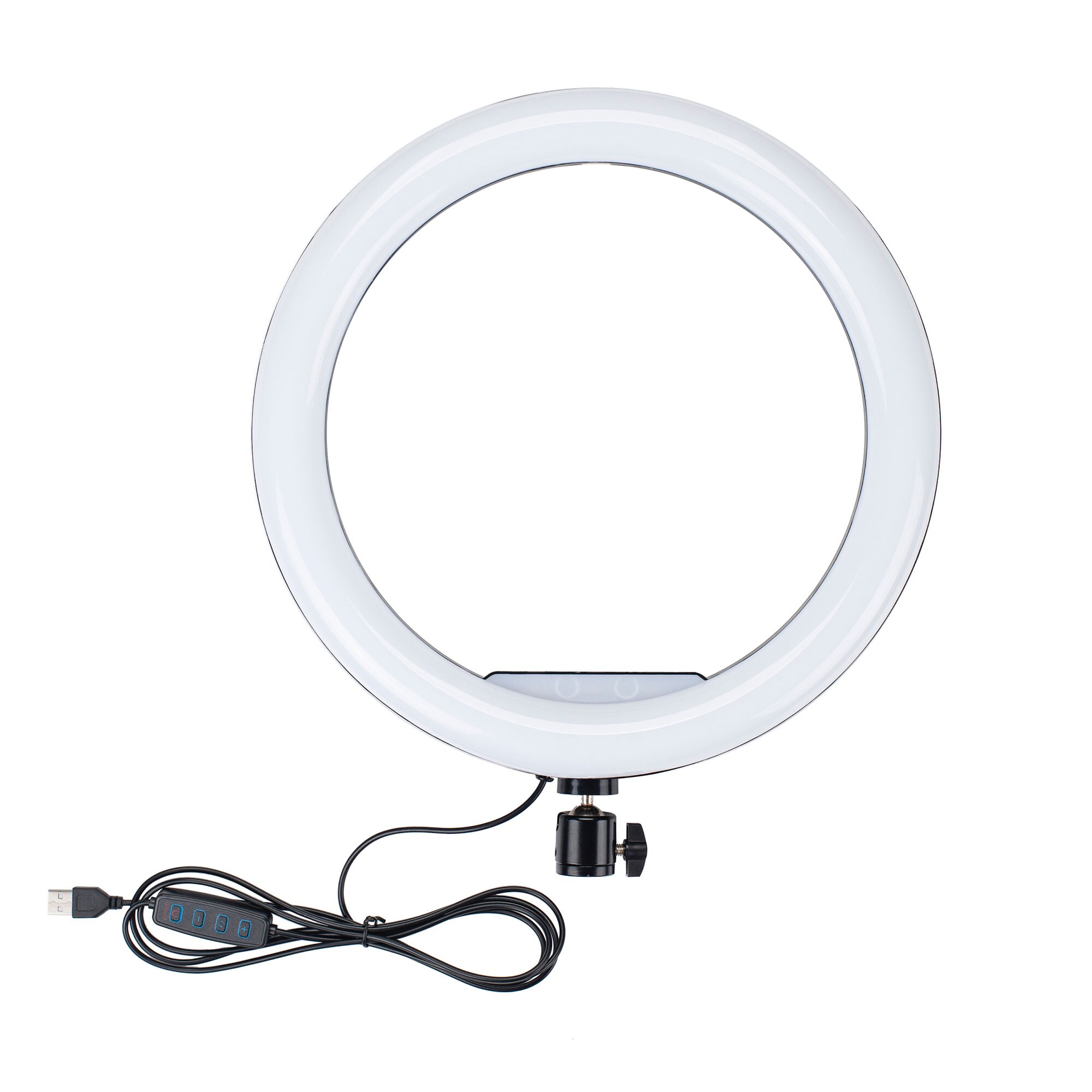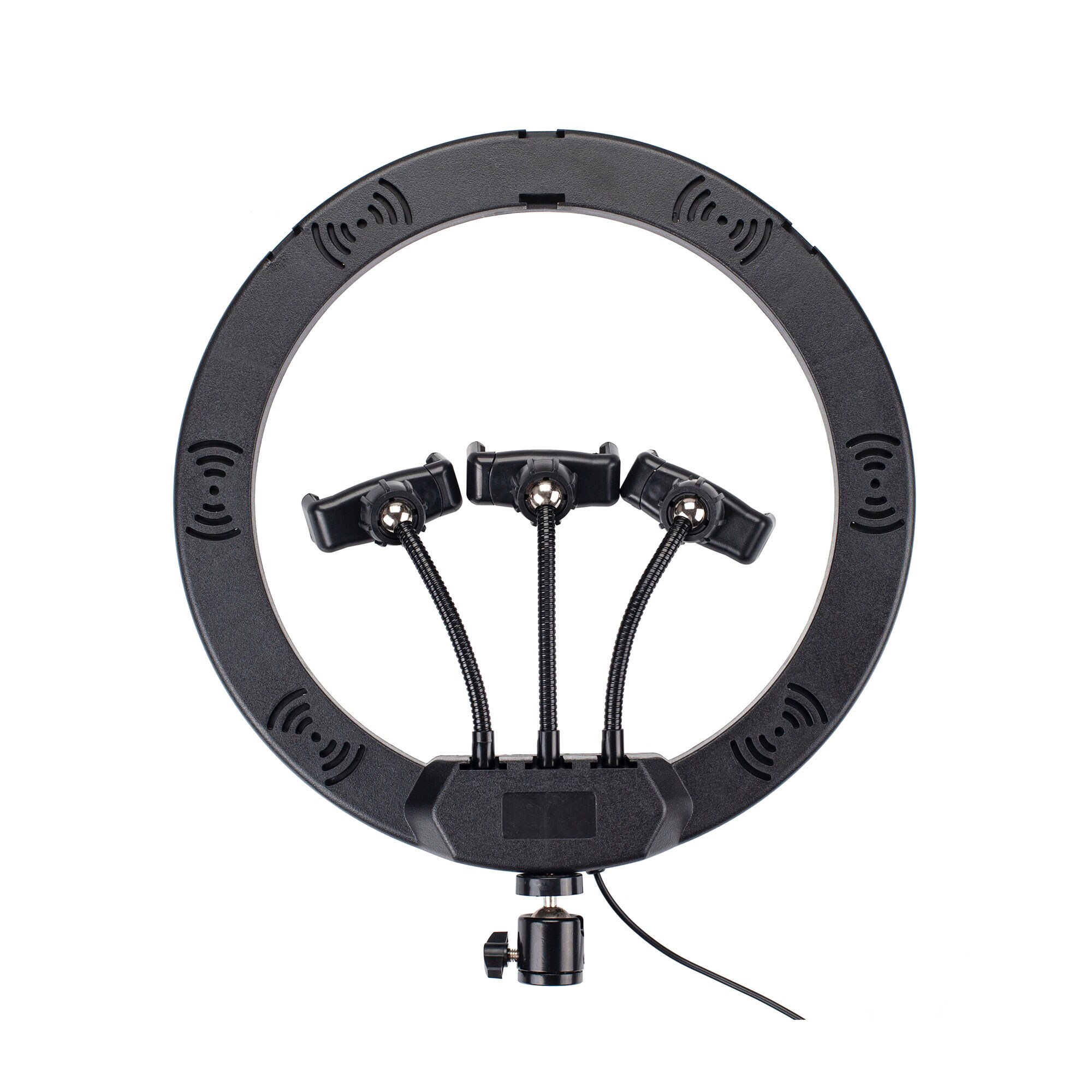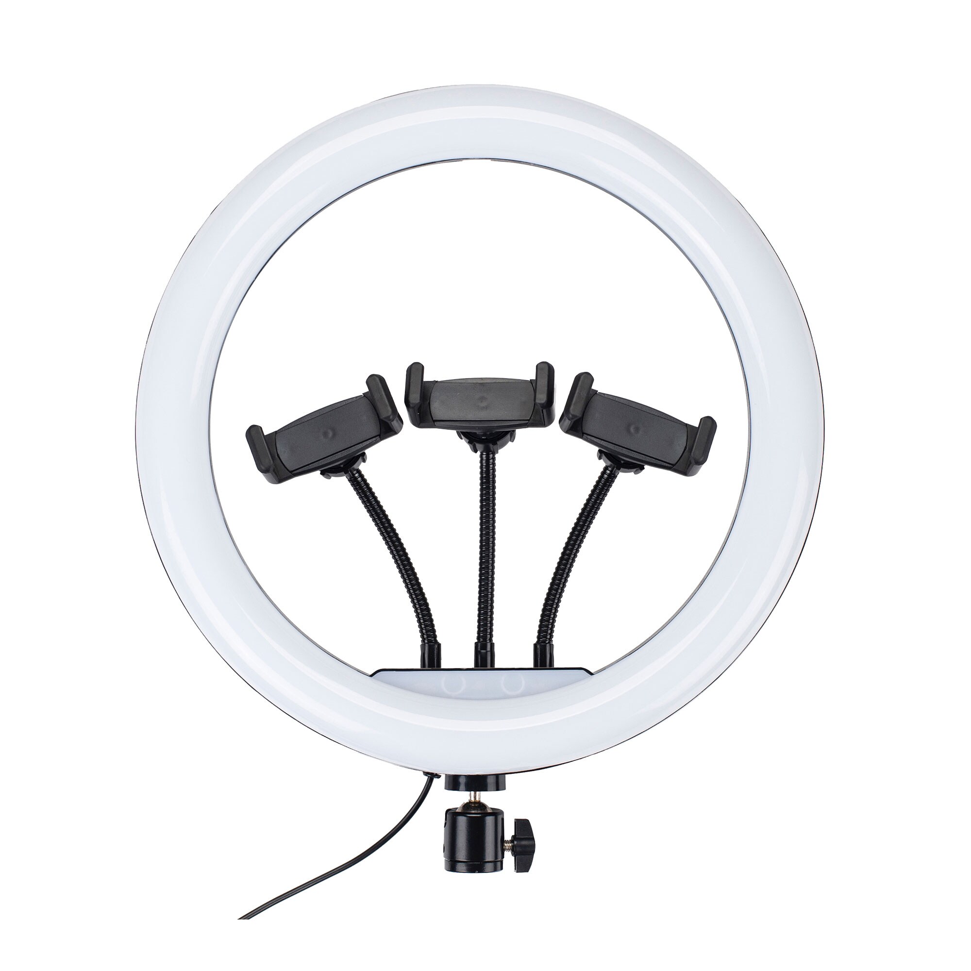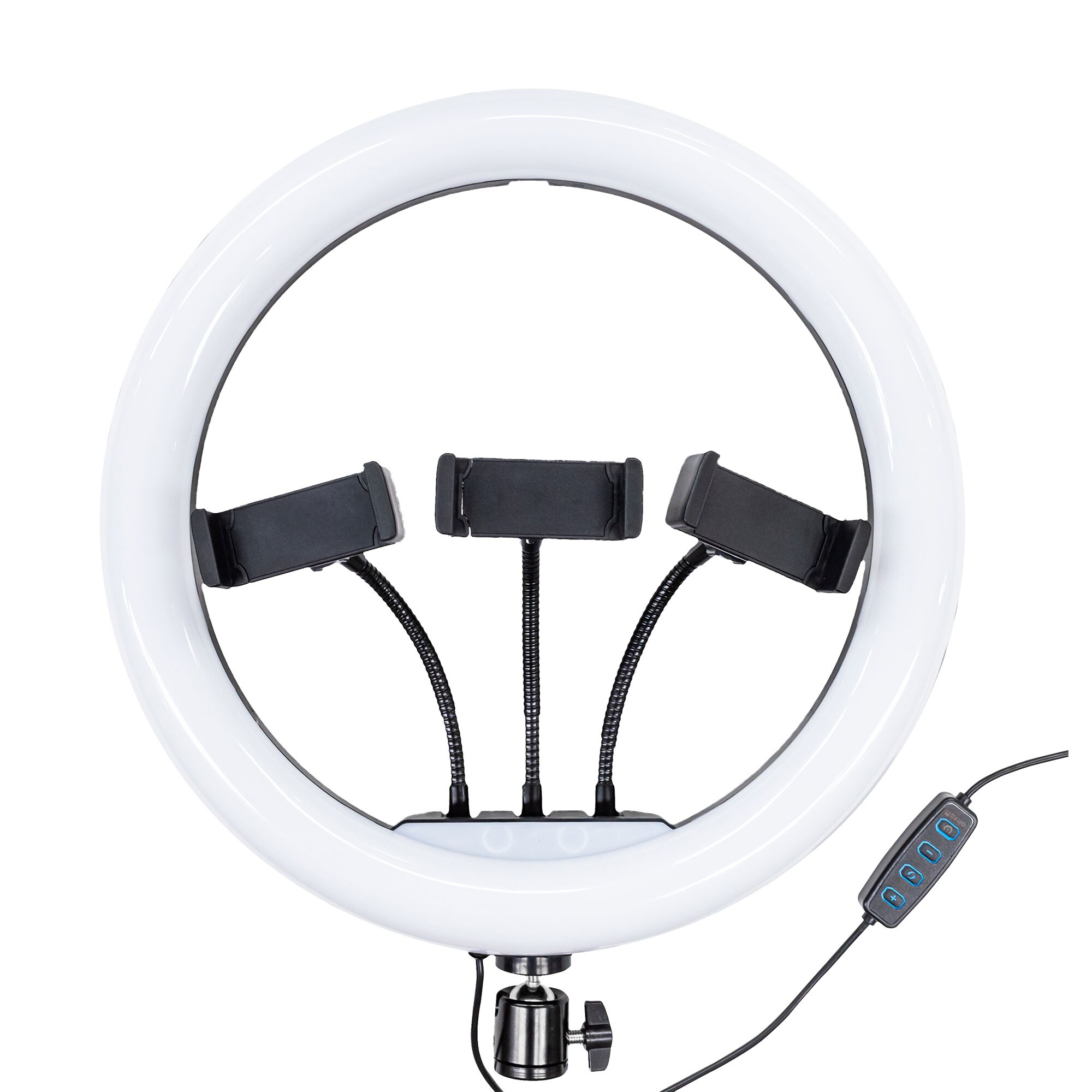 USB給電で使える大きめリング型LEDライト。12インチ(約30cm)のリングLEDで広い範囲を明るく照らし、3段階の色温度(白色/暖色/ミックス)と10段階の明るさ調整で、オンライン会議・動画撮影・商品撮影など様々なシーンに対応します。スマホホルダーが3個付属し、複数台でのライブ配信にも便利。自由雲台で角度調整もでき、照明環境を手軽に整えたい方におすすめです!