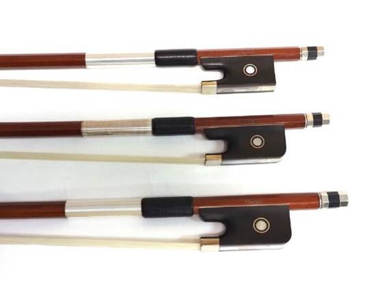 長さは約75cm、バイオリン弓とほぼ変わりませんが重さは70g前後のものが多いです。画像はバイオリン、ビオラ、チェロの順です