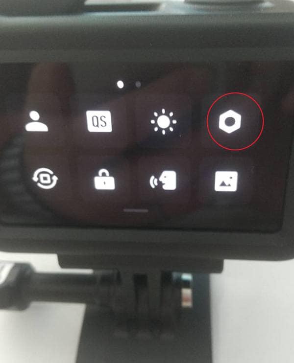 カメラの電源を入れて背面にあるタッチ画面を上から下へスワイプすると設定のマークが出てきます。
