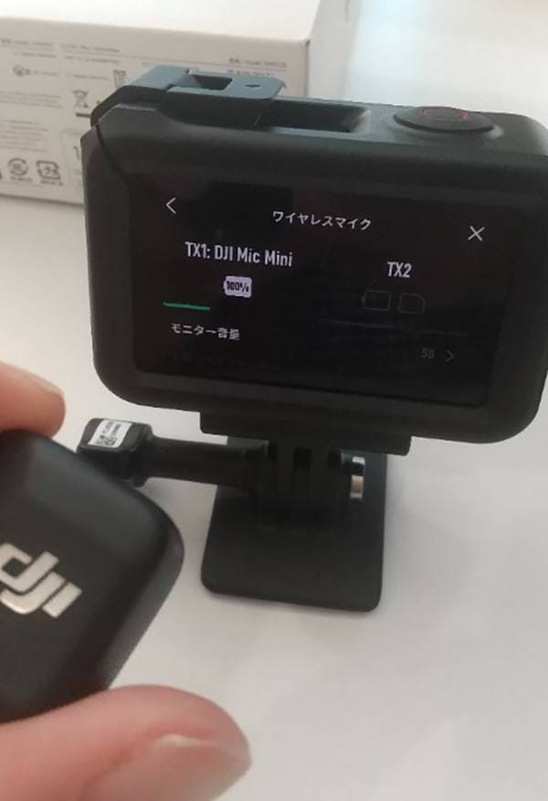 TX1をタッチして、DJI Mic Miniマイク横にある同期ボタンを長押しするとカメラ側の画面に「接続しました」という表示が出たらOKです!