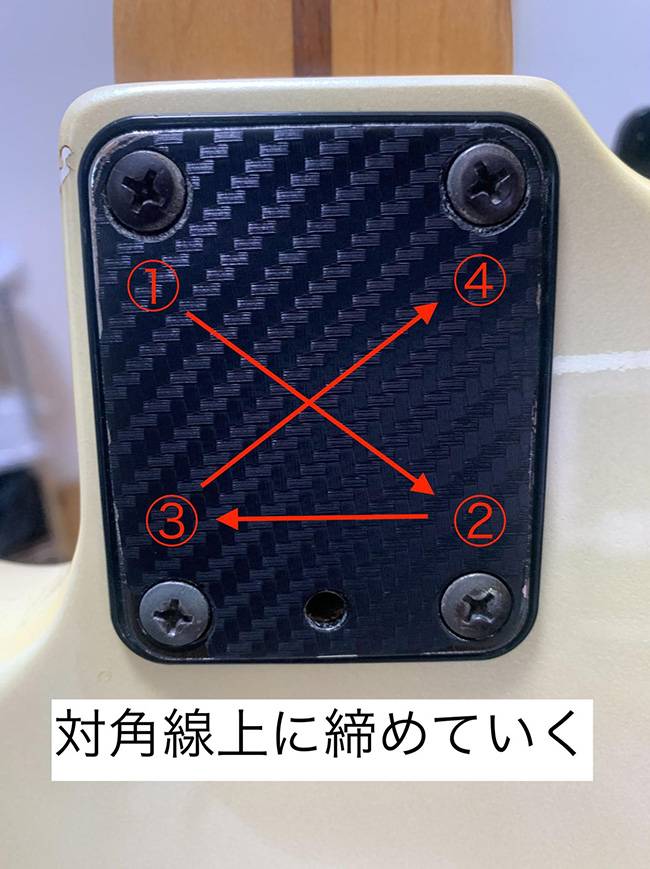 メンテナンスでネックを外した場合、ジョイント部のネジを締める際は、対角線上にネジを締めていきましょう。