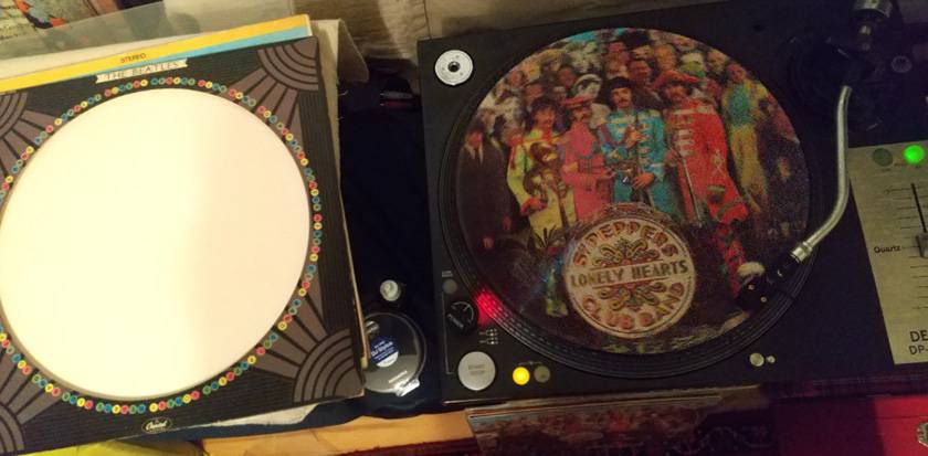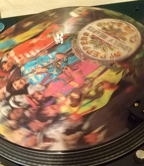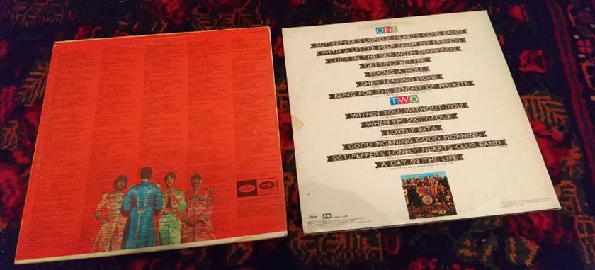 視覚的要素に左右されないよう、今回は敢えて盤が回っている姿を見ず、目を閉じて聴いてみます。針を落としてみてまず驚いたのは、40年間ほとんど手入れもしていないのに、ノイズはほとんど気にならない程度で、アナログ時代のレコード特有の柔い音と、ガッツある迫力が共存している音である事です。オープニング・ナンバーで聴けるボーカルや拍手のSEもじつに鮮やかで、とても楽しめます。先ほど述べた「音が重いという声も聞かれる」という点について申しますと、実際に音は重いです。しかし"With A Little Help~"の ベースの重低音の迫力と、アメリカミックス特有のボーカルの広がりとの絶妙なバランス、"Within You Without You"でのタブラや、アルバム・タイトル曲のリプライズ・バージョンのベースとギターは、この重さが醸し出す特有の迫力なのではとすら思える楽しさでした!2回も聴いてしまいましたが感想は変わりませんでした。