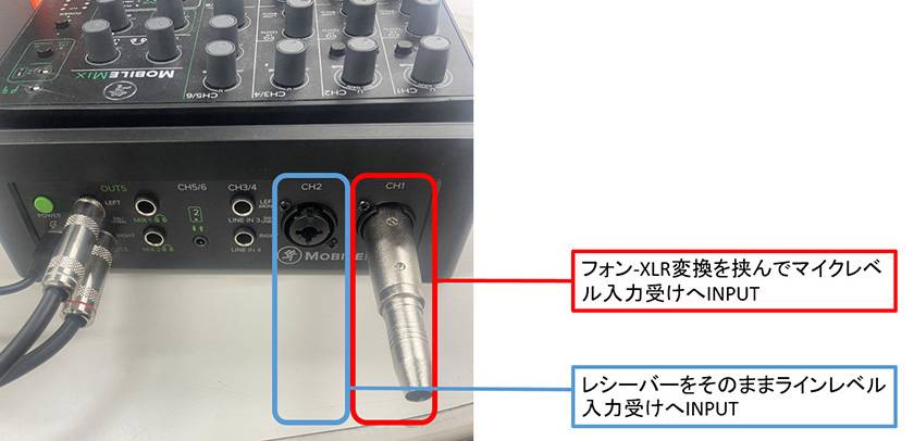 このミキサーは入力端子がコンボジャックになっていてライン受けの時はフォン端子、マイク受けの時はXLR端子で接続するという仕様です。