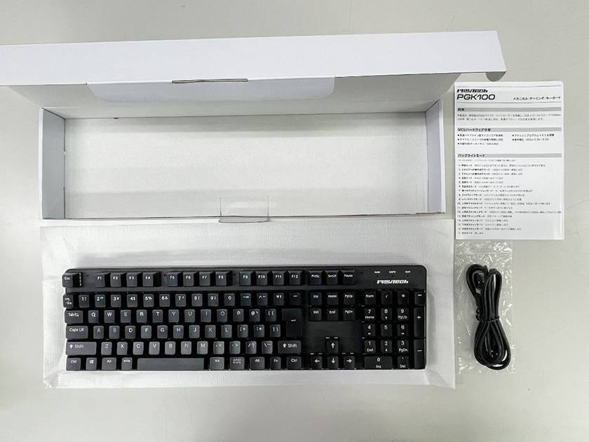 届いた箱を開けるとこんな感じ。本体のほかに、パソコンに接続するためのUSB-Cケーブルと取扱説明書が入っています。取扱説明書には、バックライトモードの切り替えパターンやコンビネーションキー機能の説明が記載されていますので、大事に取っておいてください!