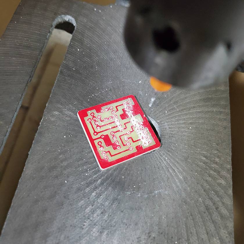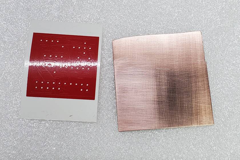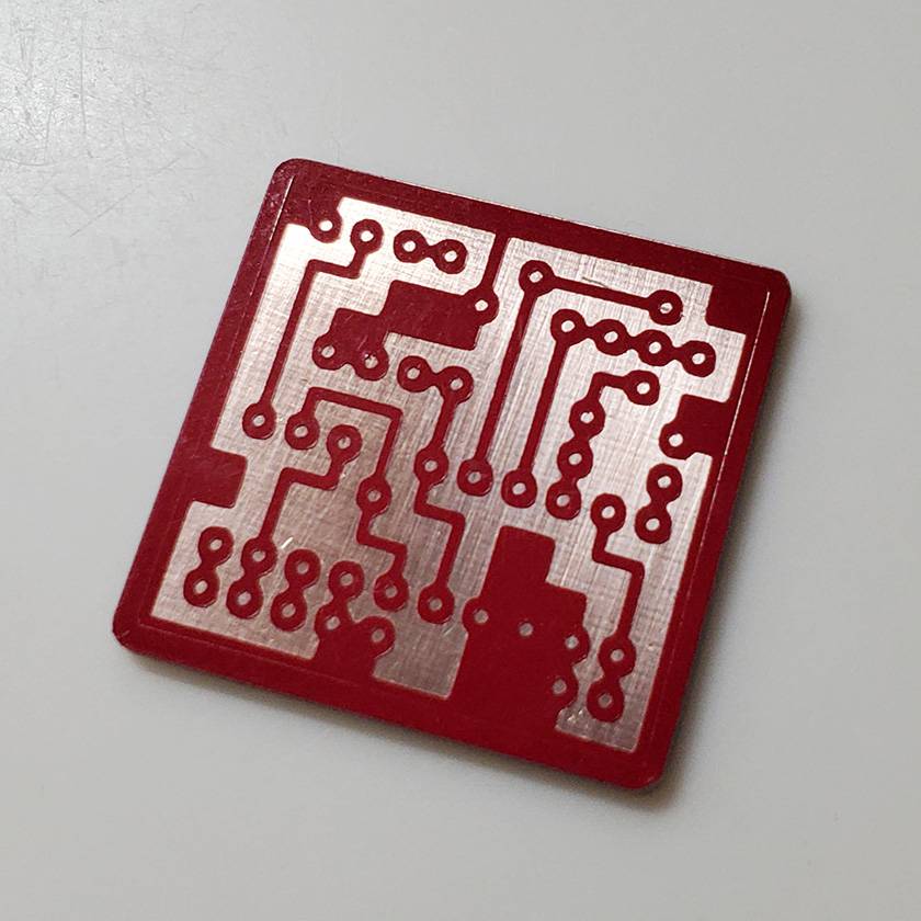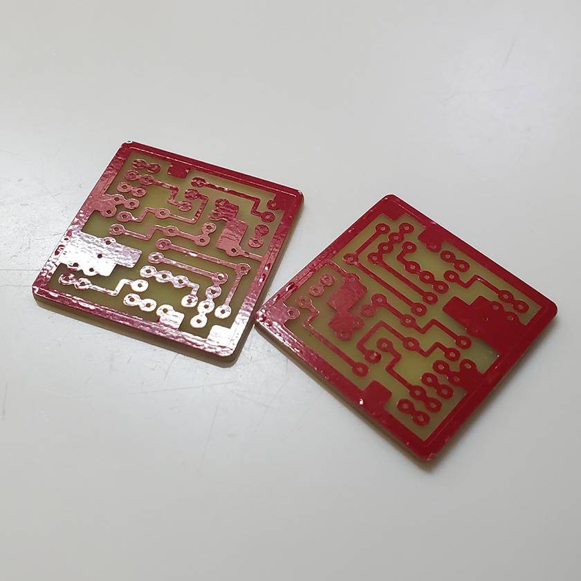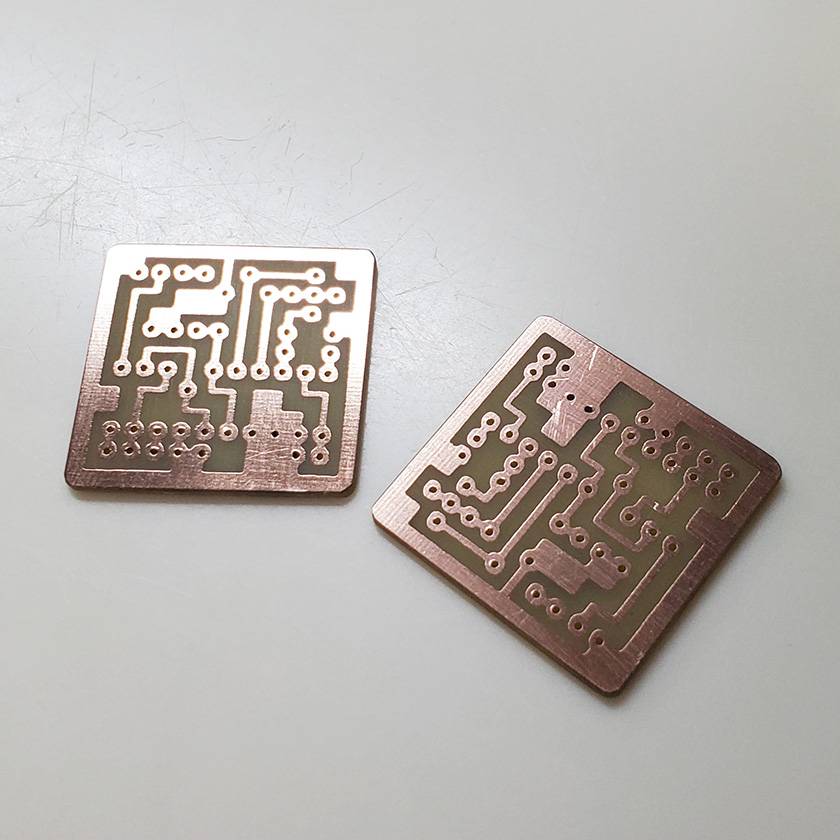 次に腐食液に漬けて、いらない部分の銅を溶かす→穴あけを行ったのがこちら