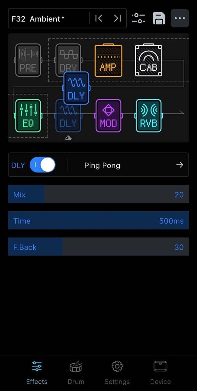 「Tone Wizard」ではアンプやエフェクトの操作・編集、プリセットの管理が可能。実際に色々と触ってみましたが、操作も直感的で分かりやすく、ラグも全くなく快適に使用できました。アプリ内蔵のドラムマシンもかなり種類が豊富で、BPMや個別の音量調節もワンタッチでできます。CABのセクションではLaneyによる15種類のIR(※1)を選ぶことができ、サードパーティ製のIRデータも最大5個まで読み込みが可能です。