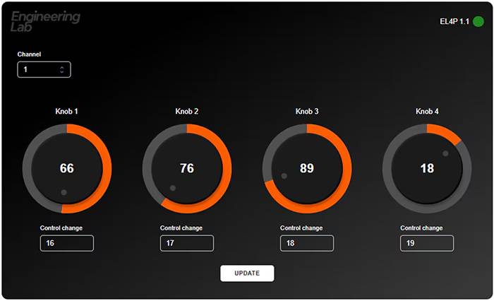 設定は Engineering Lab の提供するWEB設定ツールを使用します。MIDIチャンネルとCC値の設定ができるほか、ファームウェアバージョンや実際にツマミを回した際の値変化を確認することができます。またここで設定した内容は画面下部の「UPDATE」ボタンを押下することでハードウェアに保存され、TRS-MIDIを使用してスタンドアロン動作させる場合などでも引き継がれます。