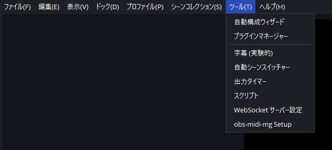 まずは前述の通りobs midi mgをインストールした後、OBSを起動してツール内に「obs-midi-mg Setup」という項目が表示されていることを確認してください。