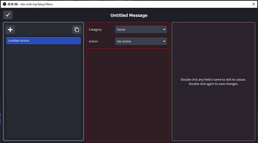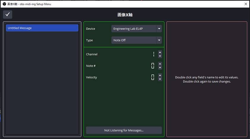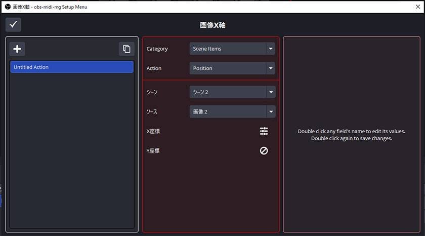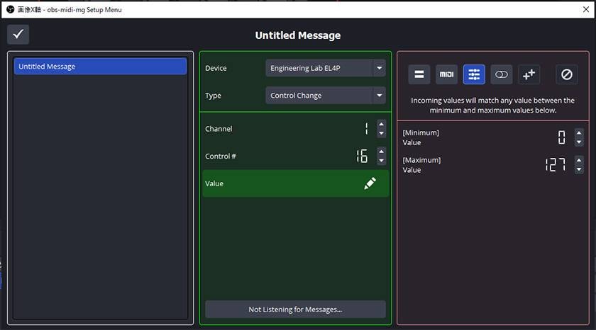 ※obs-midi-mgでは「入力されるMIDI値」と「変更したい内容」をそれぞれ設定する必要があります。